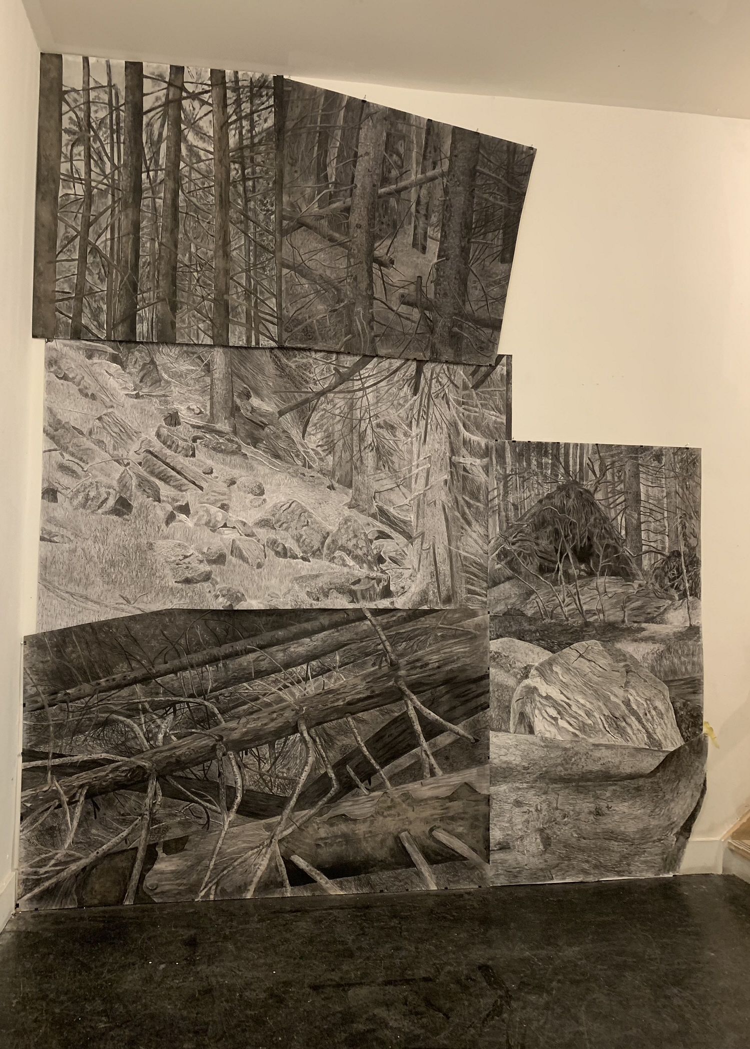 Collage of charcoal drawings. Height 450 cm-width 370 cm