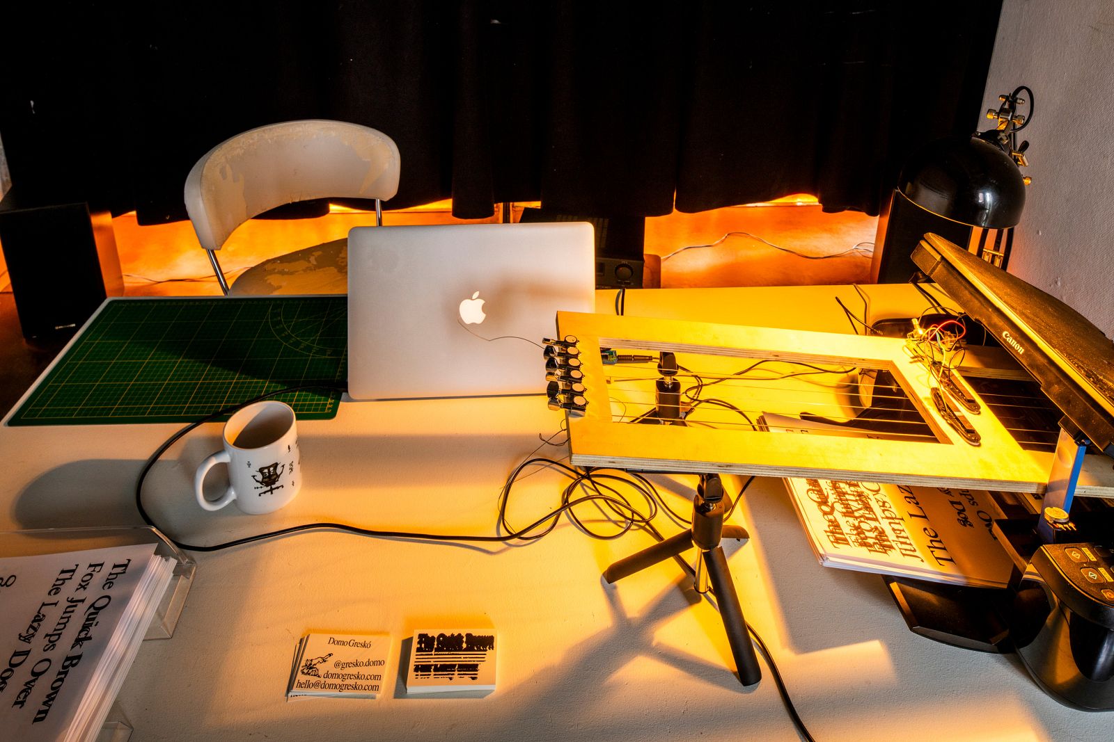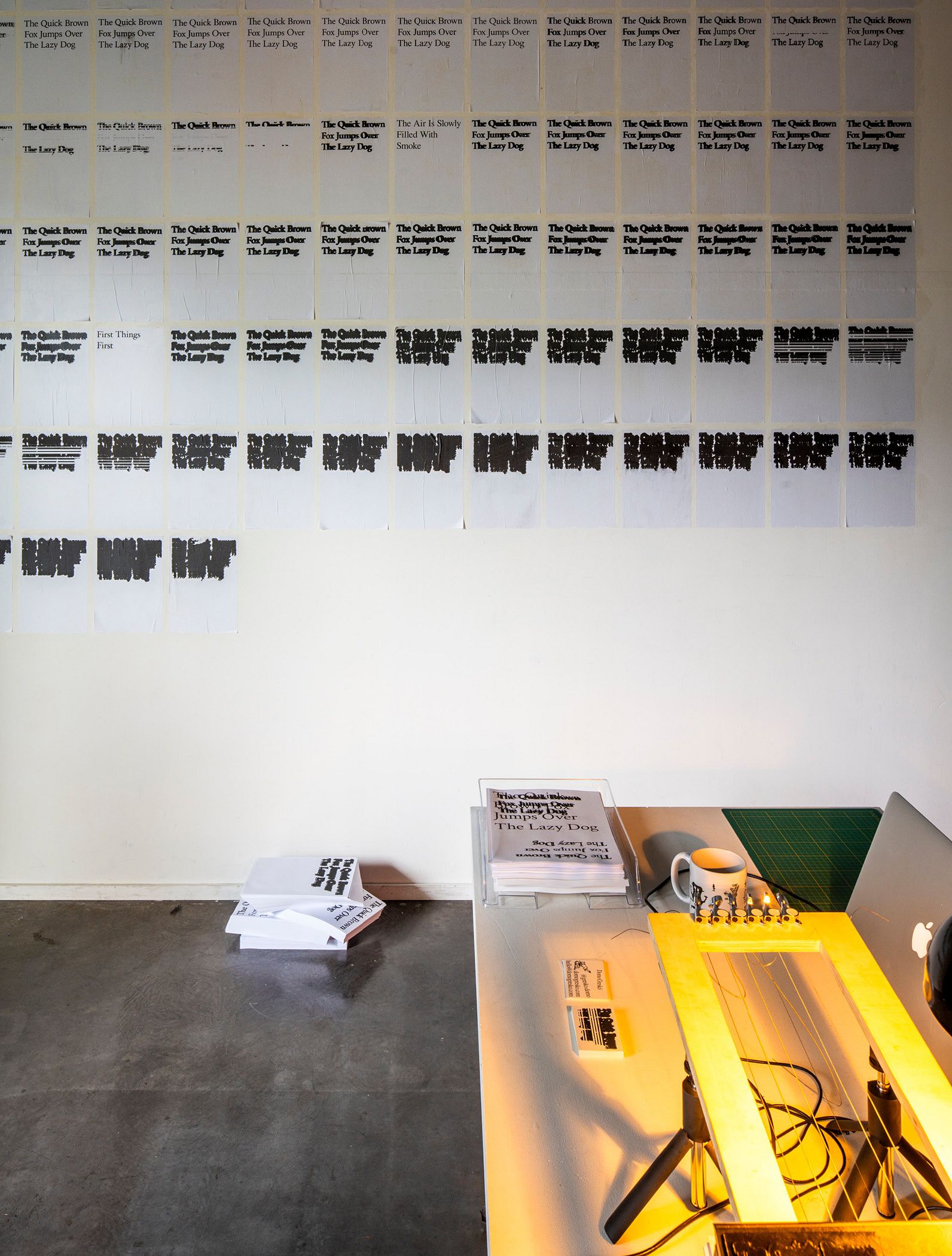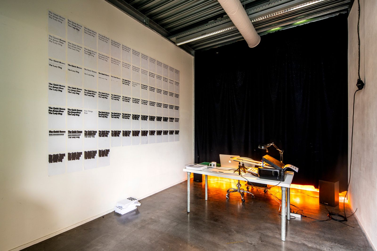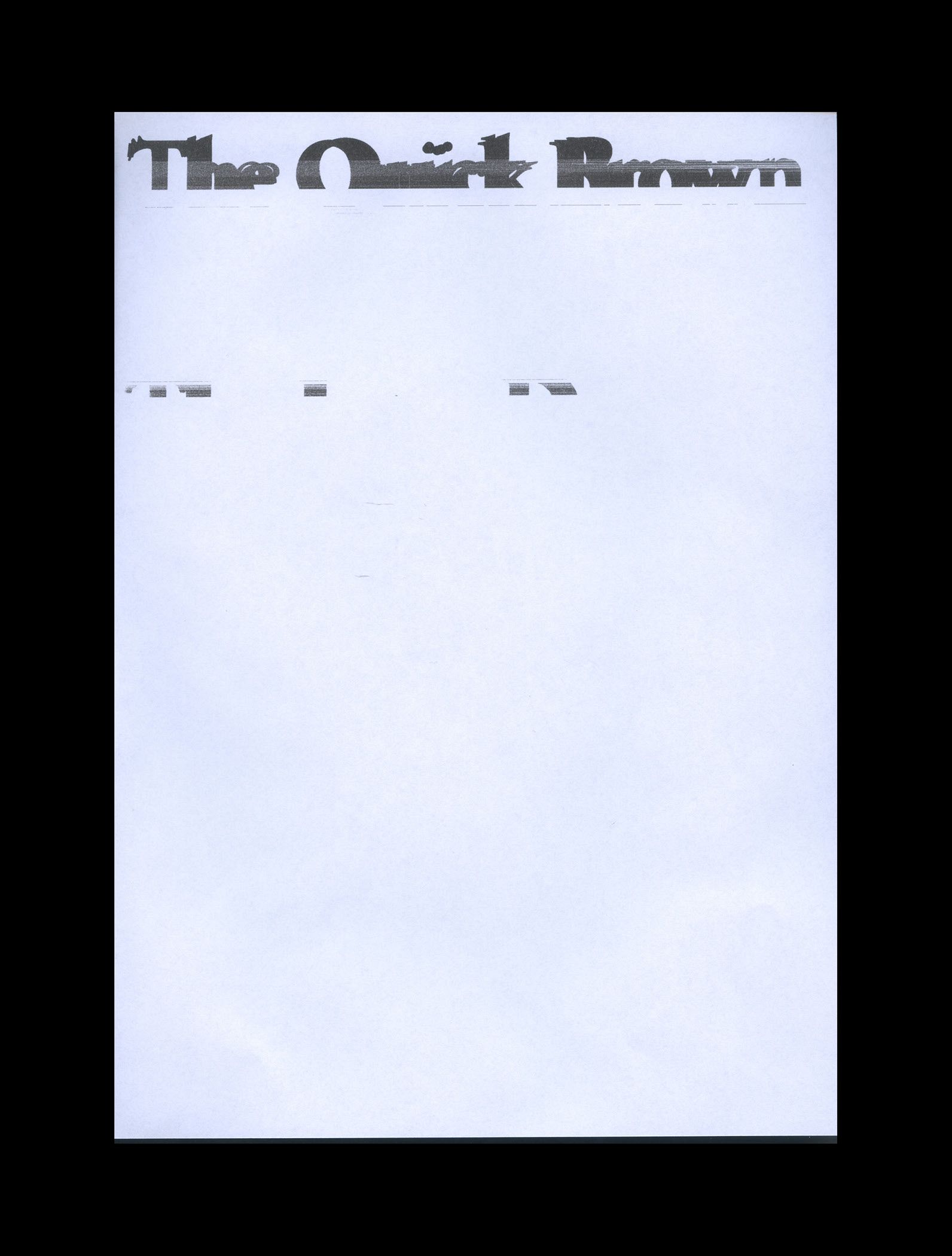 “The quick brown fox jumps over the lazy dog” is a pangram, a sentence that includes each letter of the alphabet, commonly used in graphic design. Throughout the performance, this empty sentence becomes a mantra mumbled to oneself, as the printer-turned-instrument spits out A4s full of them, set in very similar typefaces, playing sinister melodies.