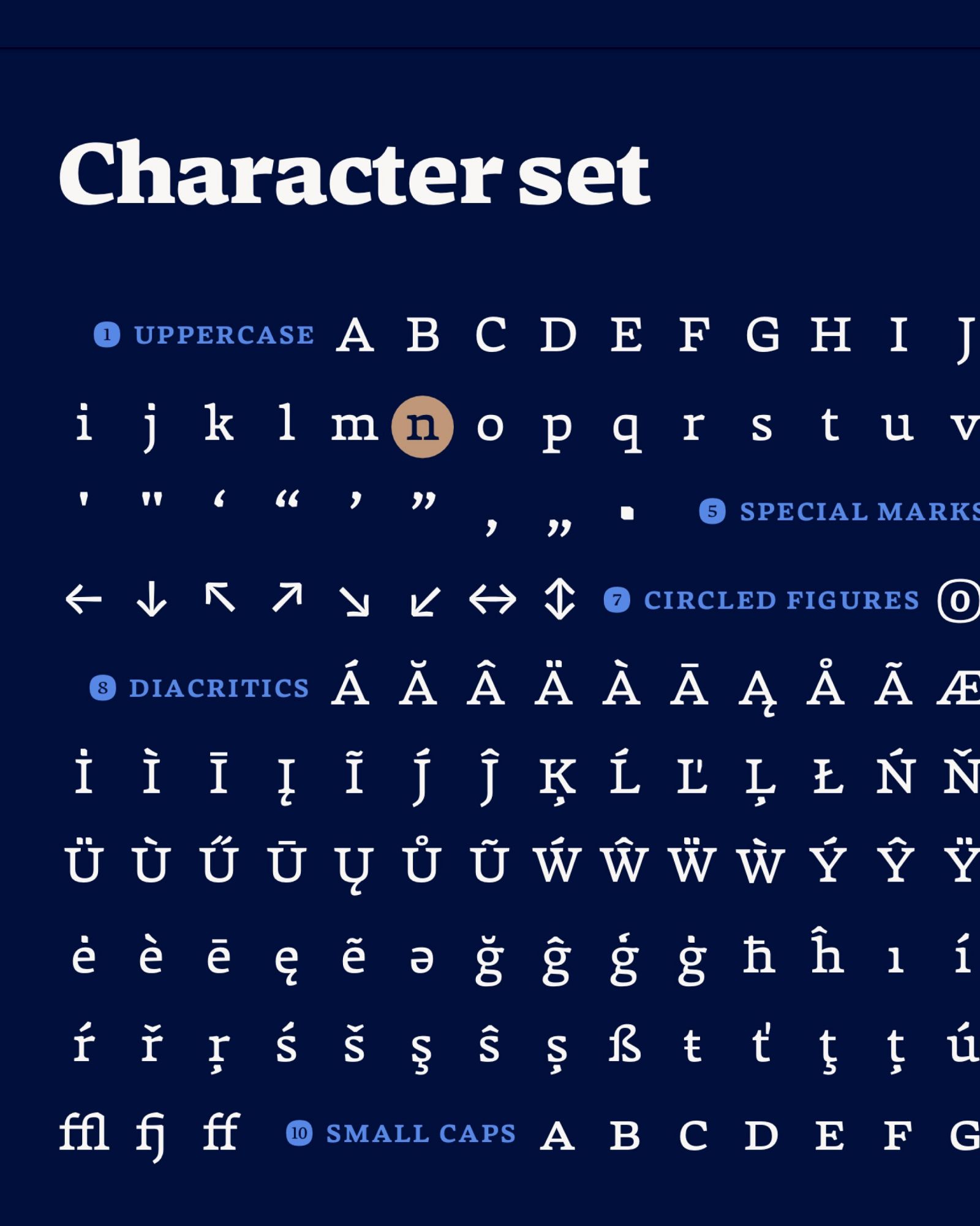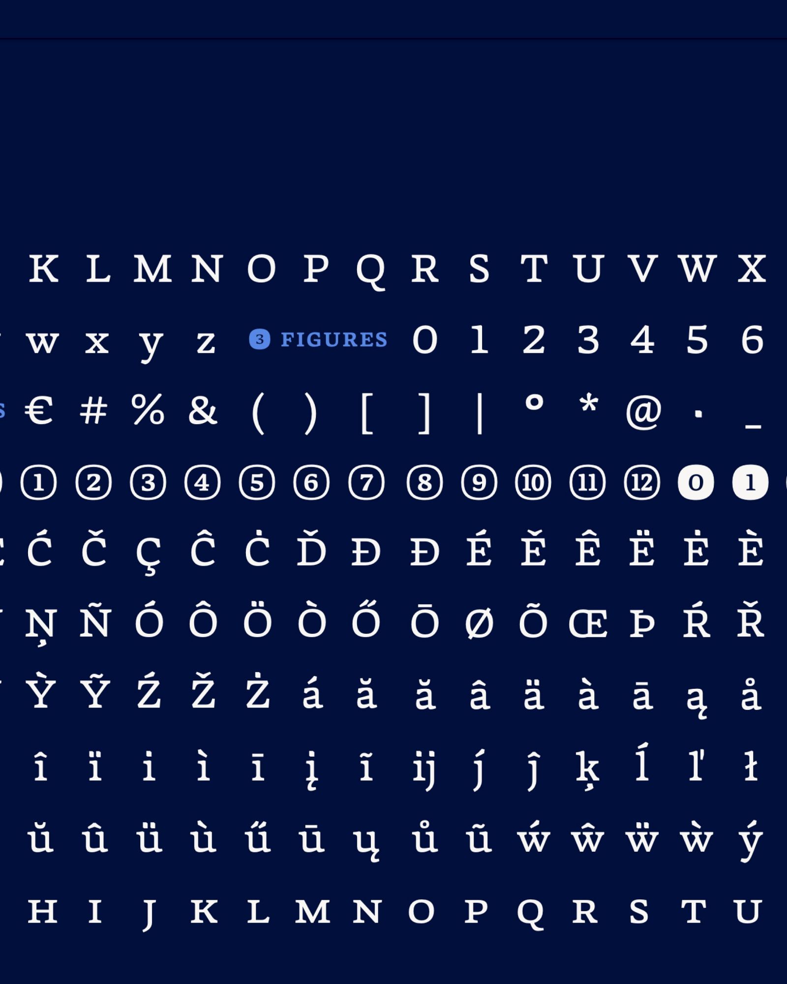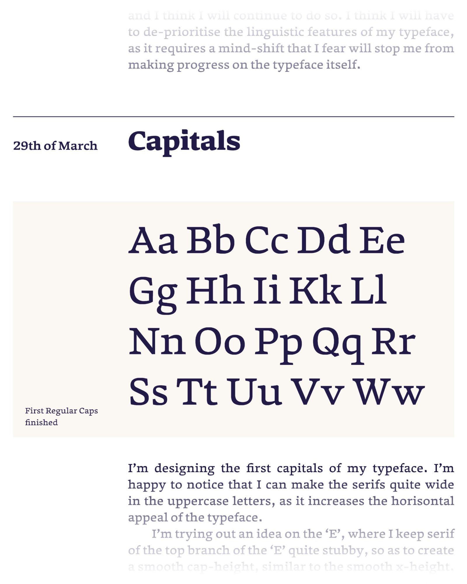 Down-scaling expectation for the final project became priority, and this resulted in my “font first — ask questions later” approach. By killing my darlings I was able to quickly start sketching on a design that could make me realise goals during the 2nd semester: Learning how to draw a conventional text typeface family. I set an abstract target of combining a rigid and organic appeal into one typeface. I also liked the idea of long serifs and a smooth x-height as I was drawn to the look and feel in my sources of inspiration. This resulted in wide and open counters and a natural wide spacing, which gave me the idea of working a typeface for extremely small sizes.